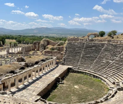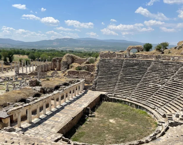 Salida temprano hacia Pamukkale. Pero antes de llegar a Pamukkale visitamos la ciudad de Afrodisias. La ciudad dedicada a la diosa de la belleza. Visita del museo donde podemos destacar varios ejemplares de la Escuela de Escultura de Afrodisias.